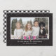 Cartes photo personnalisées de Noël avec plaid de buffle noir et blanc, chute de neige et lumières des arbres de Noël. Personnalisez facilement ces cartes de Noël en plastique noir et blanc avec votre image et un nom de famille.
