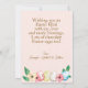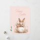 An adorable Easter bunny is sitting inside a porcelain teapot with pink roses and other lacy botanicals in and all around it. Background is a pale pink with white polka dots. Reverse side has an Easter message and Easter eggs and flowers at the bottom.
