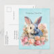 Easter postcard with a watercolor image. A white gray bunny rabbit surrounded by a garland of pink and peach roses. For bunny lovers and Easter themes and birthdays and showers.