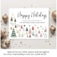 Carte de vacances moderne minimale pour votre entreprise avec des illustrations rétro abstraites de arbres et étoiles de Noël vert, terre cuite et or, "Happy Holidays" dans un script élégant et votre salutation et nom d'entreprise dans une simple typographie.