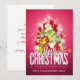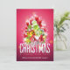 Une carte de vacances de Noël à plat personnalisée avec votre nom et message au dos. Conçue avec une illustration de Noël cool. Le texte dit Joyeux Noël et Bonne Année. Conçue avec un monticule en forme d'arbre de cadeaux avec des flocons de neige festifs, des étoiles, des boules de Noël et des étincelles brillantes. Le fond est d'une couleur rose rougeâtre vibrante.