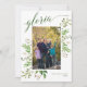 Une carte photo festive verte et blanche, comportant votre photo de portrait préférée dans un cadre de feuilles et de baies aquarelles vertes, avec "gloria" dans une police de style calligraphique moderne vert foncé assortie. Personnalisez davantage avec le nom de votre famille et l'année. Le verso est en vert foncé, avec le verset biblique «Gloire à Dieu au plus haut, et sur terre paix, bonne volonté envers les hommes! » Luc 2:14, que vous pouvez modifier.