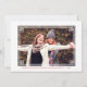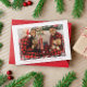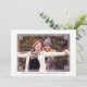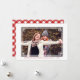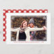Carte de vœux où vous pouvez ajouter votre propre photo dans un cadre blanc imprimé avec un motif géométrique. Ajoutez vos noms, vœux de fêtes et l'année également en lettres rouges. Le dos présente un motif à carreaux rouge et blanc.