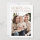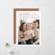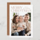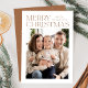 Carte photo moderne de Noël avec "Joyeux Noël" affichée en haut du design en lettrage toffee-brown tendance avec un arrière - plan blanc. Personnalisez la simple carte de Noël avec votre nom de famille et votre photo. La carte inverse pour afficher un arrière - plan brun-toffee avec des points blancs subtils (neige).