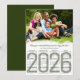 Calendrier photo de Noël 2026 Carte de vœux verte pour les fêtes de fin d'année. Envoyez vos vœux pour Noël 2025 ou la nouvelle année 2026 avec cette carte de vœux photo modifiable et un calendrier annuel 2026 que vos destinataires pourront utiliser toute l'année. Le design présente du texte et des couleurs modifiables (illustrés ici dans une police de caractères moderne verte). Le message exemple dit "NOUS VOUS SOUHAITONS DE Belles Fêtes DE FIN D'ANNÉE ET UNE BONNE ANNÉE". ASSISTANCE : Pour obtenir de l'aide concernant la modification du design ou le transfert du design sur un autre produit, veuillez contacter le concepteur AVANT DE COMMANDER via l'onglet MESSAGE de discussion Zazzle ci-dessous ou en envoyant un e-mail à makeitaboutyoustore@gmail.com.