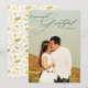 Cette charmante carte de vacances exprime avec art les sentiments de gratitude que beaucoup d'entre nous ressentent pendant les fêtes. La phrase "Cette année, nous sommes vraiment reconnaissants" est positionnée en haut de la carte, avec le mot "Reconnaissants" écrit en belle calligraphie moderne. Le design de la typographie se superpose à une photo pleine page en orientation portrait ou verticale. Personnalisez avec vos noms et votre photo de famille préférée. Le dos de la carte est orné d'un motif de feuillage en faux or.