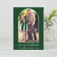 Script de calligraphie moderne et tendance Joyeux Noël Photo Arch Carte de vacances avec ornements de Noël rouge bordeaux, cônes de pin et baies sèches. Arrière - plan vert forestier