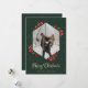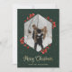 Elégante carte de Noël en aquarelle verte avec titre calligraphique, chute de neige et cadre photo géométrique orné de baies rouges. Personnalisez facilement cette carte verte de Noël avec votre photo et le nom de famille.