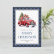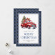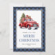 Le buffle bleu aquarelle plaid les cartes de Noël avec un camion rouge portant un sapin de Noël. Personnalisez facilement cette carte de Noël de camion rouge d'aquarelle enneigée avec votre nom de famille et votre année. Autres options de couleurs disponibles.