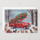 Une carte de Noël représentant un camion rouge et un arbre de Noël dans les bois enneigés entourés d'un groupe de chiots joueurs. Ce design a été créé par Debbie Quick de Debs Creative Images.