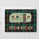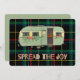 Une jolie caravane vintage, ornée de verdure festive, de baies et d'un joli nœud rouge. La porte de la charmante caravane est ouverte et invitante. La caravane est vert sauge avec une touche jaune clair. Le fond de la caravane nostalgique est un riche tartan. Le motif à carreaux est vert foncé, vert sapin, jaune doré clair et rouge baie. Sous la caravane, en lettres amusantes et ludiques, se trouvent les mots : RÉPANDRE LA JOIE. Le message de vœux par défaut au dos est : Que la période des fêtes remplisse votre maison de joie, votre cœur d'amour et votre vie de rires. Le message de vœux est facilement modifiable, si vous le souhaitez. Il existe également un modèle pour votre nom.