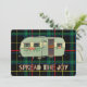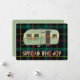 Une jolie caravane vintage décorée de verdure festive, de baies et d'un joli nœud rouge. La porte de la charmante caravane est ouverte et invitante. La caravane est vert sauge avec un accent jaune clair. Le fond de la caravane nostalgique est un riche tartan. Le motif à carreaux est vert foncé, vert sapin, jaune doré clair et rouge baie. Sous la caravane, en lettres amusantes et ludiques, se trouvent les mots : RÉPANDRE LA JOIE. Le message de vœux par défaut au dos indique : Que la période des fêtes remplisse votre maison de joie, votre cœur d'amour et votre vie de rires. Le message de vœux est facilement modifiable, si vous le souhaitez. Il existe également un modèle pour votre nom.