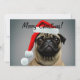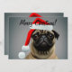 Une carte de Noël avec un carlin portant un casquette de Noël avec la typographie de Joyeux Noël.