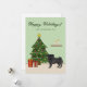 L'illustration originale de Destei d'un mignon chien de race Carlin couleur manteau noir. Le chien est debout près d'un sapin de Noël festif orné d'ornements rouges et jaunes, d'une guirlande de perles blanches et d'une étoile jaune posée sur le sommet de l'arbre. Il y a aussi deux cadeaux emballés par l'arbre et derrière le chien il y a une étagère marron avec deux bougies. Le sol est beige et la couleur arrière - plan est vert clair. Il y a aussi deux zones de texte personnalisables.