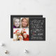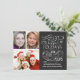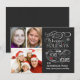 Joyeuses Fêtes de notre maison à la vôtre… Cartes de vœux plates et amusantes avec trois cadres photo. Style tableau noir tendance avec fond noir, fioritures, volutes, flocons de neige, houx, pin et branches de baies créent un cadre hivernal fantaisiste avec une typographie rétro élégante et lettrage calligraphié en écriture cursive tourbillonnante. Ce modèle est configuré pour une photo de famille (une version pour les jeunes mariés/les fiancés est disponible), mais vous pouvez facilement changer le thème. Ajoutez votre photo de famille préférée des fêtes et personnalisez le texte. Un moyen contemporain d'envoyer des vœux de joyeuses fêtes d'hiver à tous vos amis et proches avec une touche vintage élégante. Timbre assorti, invitations de fête de fin d'année et cartes de vœux disponibles sur demande.