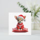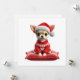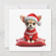 Charmez vos proches avec ce Chihuahua mignon dans un pull rouge festif et chapeau de Père Noël, perché sur un coussin douillet. Une carte chaleureuse pour la saison des fêtes.