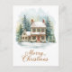 A beautiful, watercolor-style illustration featuring a traditional, two-story farmhouse nestled in a snowy forest of pine trees. The house is decorated for the holidays with wreaths and red bows on the porch and windows. Snow blankets the roof and ground, creating a serene, winter wonderland atmosphere. The warm greeting "Merry Christmas" is scripted below the image in a rich, inviting copper color, making it an ideal card or wall print.