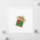 Un chat tabby orange sort d'une boîte cadeau de Noël recouverte de papier rayé kitty rouge et vert, de ruban or et d'arc. Art de Margaret Loftin Whiting.