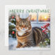 Cette carte de Noël festive présente une image d'un chat tigré mignon assis à l'extérieur de sa maison par un après-midi enneigé, avec des plantes et des baies d'hiver. Avec un message de 'Joyeux Noël' en haut, la carte est d'un blanc uni au verso pour votre propre message.