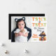 Un mignon chat noir dans un casquette de sorcières portant un jack-o-lanterne et assis parmi les fleurs avec encore un autre jack-o-lanterne à ses pieds "Trick ou Treat" "Happy Halloween" carte photo de famille de vacances. Conception composite par Holiday Hearts Designs.