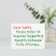 Cher Père Noël, Veuillez Renvoyer Toutes Les Demandes De Renseignements Sur Le Comportement Nillement À Mon Procureur. Le cadeau de Noël amusant pour les enfants et les adultes - c'est le classique hilarant pour battre tous les Chers Designs Père Noël. Drôle et totalement original, cette lettre d'avocat à Père Noël fait un grand cadeau de Noël ou pourrait être juste quelque chose de amusant à montrer autour du bureau pour les vacances. Voici un original de Inside Out. Si vous l'avez vu ailleurs, ils me l'ont volé.