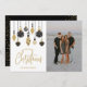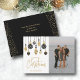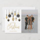 Flat holiday photo greeting cards feature black and gold (not metallic) Christmas tree ornaments with the words Merry Christmas and your family name on the front. Your personalized greeting and first names are printed on the back. PRINTED and/or INSTANT DOWNLOAD! MATCHING items in our collection.