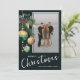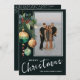 Elegant Christmas holiday flat photo cards feature your photo and a design of pine branches, green and gold Christmas ball ornaments and ribbons on a dark green background with your details in chic lettering on the front and your personal greeting and names on the back. Order PRINTED and/or INSTANT DOWNLOAD to send digitally. MATCHING items in our collection.