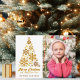 Une carte de Noël en or chic avec votre photo de famille à côté d'un bel arbre en flocons dorés au-dessus de Joyeux Noël et Bonne Année. Cette carte photo branchée dispose d'un trio de jolis flocons de neige à l'arrière pour les vacances.