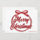 Scénario moderne et chic à travers un magnifique ruban rouge et arc lit MERRY CHRISTMAS en élégante typographie cursive. Un noeud attaché est super tendance pour les cartes postales de vacances 2025 non photo. Personnalisez avec votre nom de famille ou d'entreprise dans le coin inférieur droit.