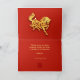 Chinese firecrackers and old Chinese calligraphy of Horse in red as background for a large golden 2026 (original handwritting) with golden greeting in Chinese + "HAPPY CHINESE NEW YEAR" + "Year of the Horse" (original handwritting) and golden paper-cut (printed image) of a horse. Design on horizontal greeting card. Matching holiday postcard, invitation, and more soon... Perfect for Chinese New Year of The Horse 2026.