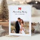 Cette carte de vacances élégante et chic, noire et blanche pliée pour les jeunes mariés dit "Marié & Joyeux" en script lunatique. Un arc coquette branché et votre photo de mariage préférée sont présentés à l'avant. Vous pouvez changer l'arc en n'importe quelle couleur, et vous pouvez aussi changer la couleur de tout le texte ! Une excellente façon de souhaiter Joyeux Noël à vos amis et votre famille pendant votre premier Noël ensemble en couple marié.