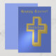 L'œuvre d'art présente une croix chrétienne dorée allumée dans un design minimaliste sur fond bleu iris, avec deux vœux de Pâques dans des champs de typographie personnalisables qui lisent actuellement "Christ Est Ressuscité !" et "Joyeuses Pâques !"