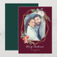 Cette élégante carte de vacances présente un joli cadre géométrique doré orné de bouquets floraux de Noël festifs, le tout sur un fond rouge festif. Les bouquets sont composés de roses, de poinsettias, de pommes de pin, de baies et de branches de pin. Personnalisez avec un message de vacances personnalisé, vos noms et votre photo préférée. Le dos de la carte est d'une belle teinte de vert forêt, mais peut être personnalisé à n'importe quelle couleur de votre choix !