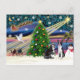 Magie de Noël avec deux Boston Terriers. L'étoile de Bethléem illumine le chemin de trois sages tandis que Père Noël et ses rennes volent dans la nuit. Une colombe et un bonhomme de neige ajoutent aux symboles de la période de Noël.