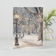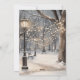 A quiet winter night scene featuring softly glowing street lamps, falling snow, and string lights in a peaceful park setting. This illustrated Christmas card captures a calm, timeless holiday mood. The message reads Wishing you peace, joy, and happiness this holiday season with space to personalize your name or signature at the bottom.