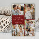 Ces belles cartes de Noël photo présentent cinq modèles de photo, une typographie moderne élégante avec la mention "Joyeuses Fêtes", et un motif floral dessiné à la main au dos dans des couleurs classiques de vert foncé, rouge bordeaux et ivoire sur un fond sable / beige. La couleur de fond sur le devant peut être personnalisée à la couleur de votre choix (ici en rouge). Facile à personnaliser pour de belles cartes de vacances qui impressionneront toute votre famille et vos amis.