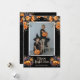 Photo personnalisée Carte d'Halloween avec une photo ornée d'un jack-o-lanternes d'aquarelle en casquette noir, fleurs violettes et oranges et verdure. Personnalisez facilement cette jolie carte d'Halloween avec votre photo et le nom de famille. Cette carte photo Halloween peut être transformée en n'importe quelle couleur à l'aide de l'outil de personnalisation.