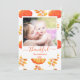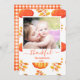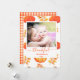 Carte de vœux photo Citrouille Joyeux Thanksgiving avec citrouille orange et motif de feuilles d'automne à l'avant et motif à carreaux orange à l'arrière. Modifiez le texte et la photo en utilisant l'option de personnalisation de ce modèle. Crédit photo : Satya Tiwari sur Pixabay.com