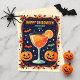 Transportez vos amis à une fête d'Halloween endiablée avec cette carte de vœux rétro. Le design présente un verre à cocktail orange brillant, garni d'une tranche de citron, sur un fond bleu marine étoilé. De part et d'autre de la boisson, deux citrouilles-lanternes joyeuses et des chauves-souris en vol, le tout encadré par une bordure élégante et fluide de fleurs et de feuilles orange. C'est le mélange parfait de décontracté et de chic pour votre message de vacances personnalisé.