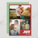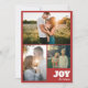 La conception présente un texte gras moderne qui lit "Joie" avec un modèle de nom de famille personnalisé dans un script manuscrit élégant et une carte de vœux de vacances en collage photo à trois. Le rouge vintage avec du vert menthe ajoute une touche moderne. le rendant un souvenir parfait pour vos proches.