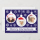 Une carte de Noël photo pour une famille avec des enfants. Elle comporte 3 boules blanches avec des photos rondes à l'intérieur : une fille, un garçon et un bébé, tous avec des chapeaux de Père Noël rouges. Les boules sont entourées de flocons de neige blancs. Le message Joyeux Noël est écrit dans un cadre en ruban blanc, avec les noms en dessous en majuscules. Le fond est bleu foncé.