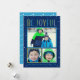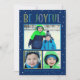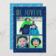 Cette carte de vacances moderne et lumineuse « Be Joyful » comprend un collage de trois (3) photos et un texte personnalisable. Schéma de couleurs bleu marine, vert, jaune/chartreuse, gris et bleu clair avec des points blancs enneigés.