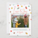 Cartes photos de vacances imprimés sur mesure avec un modèle do-it-yourself simple pour la personnalisation. Ce design amusant et minimaliste a une superposition colorée de points de confetti avec des accents faux en cuivre. Ajoutez votre photo de famille, votre salutation personnelle, vos noms et l'année. Utilisez les outils de conception pour modifier les polices et les couleurs. Reverse side dispose d'espace pour ajouter plus de photos et de texte.