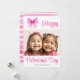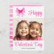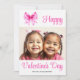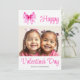 Coquette pink bow with hearts and stripes Valentine's Day photo Holiday Card. This card features a family photo and a pink coquette bow with magenta hearts on the upper left corner. The cheerful phrase "Happy Valentine's Day" is in script typography. The back reveals an appealing pattern of irregular pink, magenta and white stripes and scattered hearts.