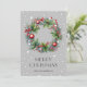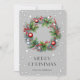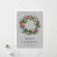 Cartes de Noël à l'aquarelle ornée d'une couronne de Noël de branches d'épinette et décorée d'ornements, de rubans, de baies saintes et rouges contre un arrière - plan gris étoilé. Personnalisez facilement ces élégantes cartes de Noël aquarelle avec votre nom de famille et votre texte.