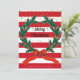 Un beau design avec une couronne vintage de houx et de baies de Noël encadrant les mots "Joyeux Noël" sur un fond à rayures rouges et blanches. Idéal pour les cadeaux et la décoration de Noël.