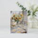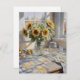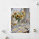 La lumière du soleil coule à travers deux fenêtres, projetant des ombres ludiques sur une table en bois ornée d'un bouquet de tournesols dans une jarre en verre. La table contient également un bol de fruits, un pot en verre et un tissu à damiers.