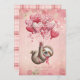 Happy Valentine's Day romantic card with a personalized message and a sloth illustration with heart balloons. Pink and red background with a plaid backing.
