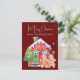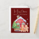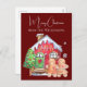 Cette carte postale de Noël personnalisée présente une jolie aquarelle illustrant les gens en pain d'épice. Un petit homme et une dame en pain d'épices se tiennent devant leur maison colorée en pain d'épices. Un joli arbre décoré se trouve sur la gauche. L'arrière - plan est une riche couleur bordeaux.