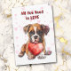 Le devant de cette mignonne carte de la Saint Valentin a l'image d'un adorable chiot Boxer tenant un coeur rouge. Le texte en haut dit "Tout ce dont vous avez besoin est l'AMOUR" L'intérieur complète la pensée, et dit aussi "Heureuse Sainte-Valentin". Tout le texte, à l'avant et à l'intérieur peut être customisé à tout ce que vous préférez.